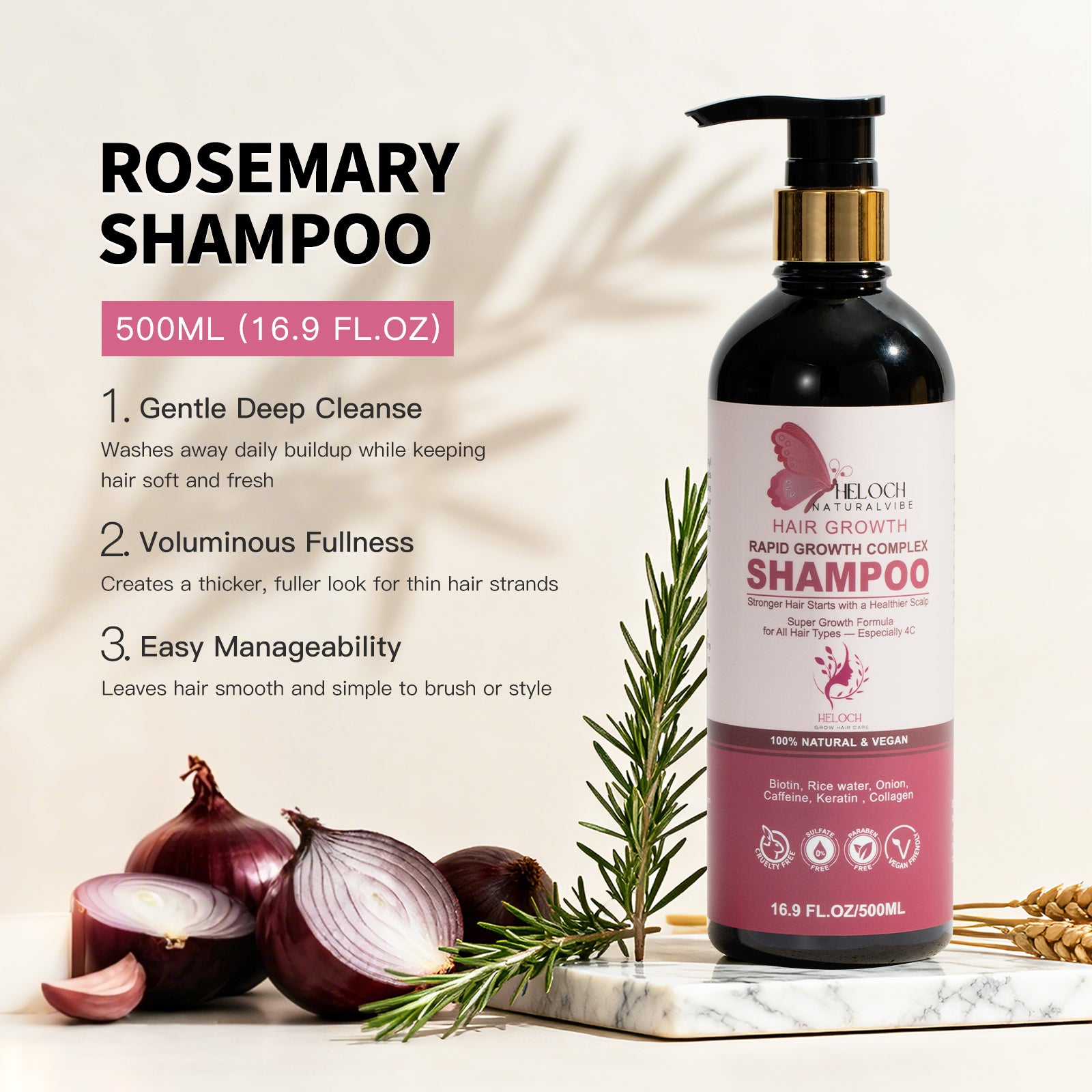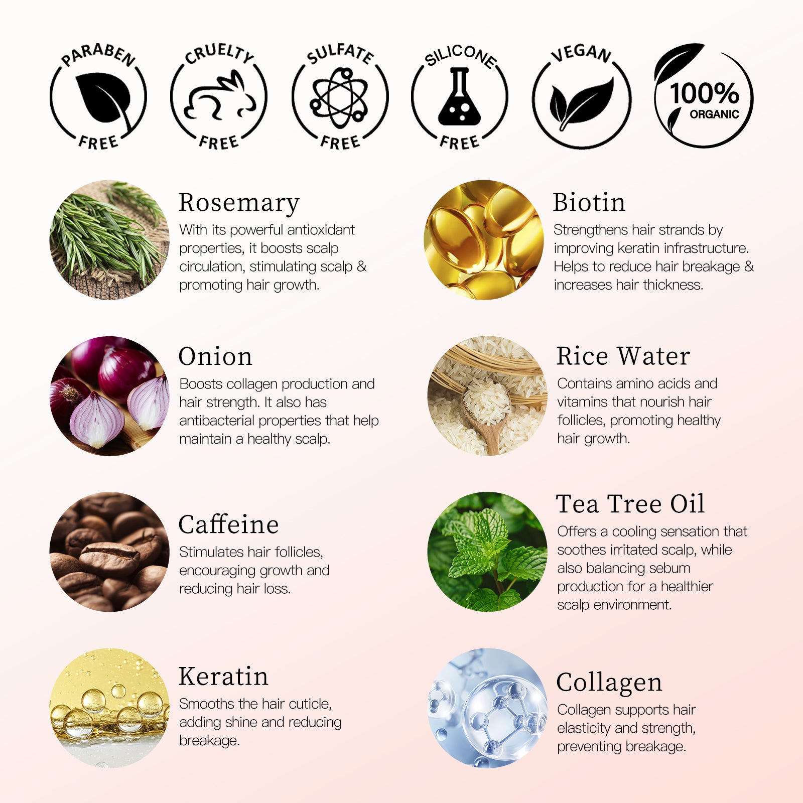 Biotin, Rice Water, Onion Extract, Caffeine, Keratin & Collagen